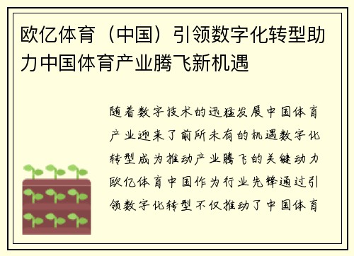 随着数字技术的迅猛发展,中国体育产业迎来了前所未有的机遇,数字化转型成为推动产业腾飞的关键动力。欧亿体育(中国)作为行业先锋,通过引领数字化转型,不仅推动了中国体育产业的升级,还为行业注入了创新的活力。本文将从四个方面详细探讨欧亿体育(中国)如何通过数字化转型助力中国体育产业的发展,分别是技术创新与智能化应用、数字营销与观众互动、数据分析与运动科学、以及产业融合与全球化布局。通过这四个方面的分析,全面呈现欧亿体育(中国)如何为中国体育产业提供新机遇,推动其迈向更加繁荣的未来。