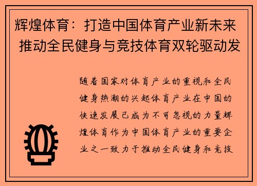 随着国家对体育产业的重视和全民健身热潮的兴起,体育产业在中国的快速发展已成为不可忽视的力量。辉煌体育,作为中国体育产业的重要企业之一,致力于推动全民健身和竞技体育的双轮驱动,努力打造中国体育产业的新未来。本文将从辉煌体育的战略定位、产业布局、创新驱动和国际化发展等方面进行详细探讨,分析其如何通过推动全民健身与竞技体育的双轮发展,塑造未来中国体育产业的新格局。通过深入分析辉煌体育的成功经验和前景规划,本文期望为中国体育产业的未来发展提供有益的启示和借鉴。